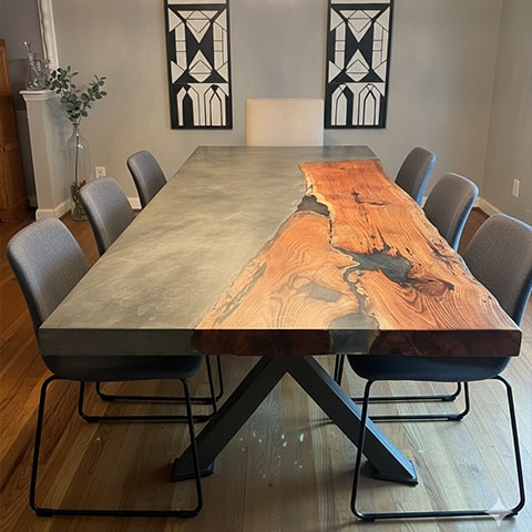 Mix materials for a one-of-a-kind look make a great pair such as a concrete tabletop with a wood, metal, or steel base for striking contrast. Whether it’s a concrete dining table or an outdoor centerpiece, each piece is hand-crafted to make a lasting impression.